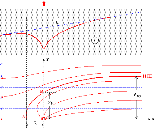 2. Если такие источники установлены, то (после предварительного выбора места и конструкции водозабора) необходимо оценить ВОЗМОЖНОСТЬ ПОПАДАНИЯ некондиционных вод в водозахватные устройства. Для этого необходимо обосновать зону захвата водозабора. Под ней понимается та часть области эксплуатационной депрессии напоров, в пределах которой все линии тока приходят в водозабор. Граница зоны захвата - нейтральная линия тока (НЛТ). Зона захвата может быть построена аналитически (в простых гидрогеодинамических схемах) или по результатам моделирования. Основой для ее построения служит гидродинамическая сетка, полученная графическим путем или путем решения обращенной задачи на модели.