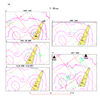 В нижних горизонтах земной коры и переходном от коры к мантии слое, как видно из рис.2,Б и рис.3,Б, подобной зависимости в размещении очагов землетрясений от направления миграции сейсмичности не наблюдается. Несмотря на различие размеров эпицентральных зон на всех стадиях вулканической деятельности ГДП землетрясения в интервале глубин 20-40 км располагаются вокруг и внутри заштрихованной на рисунках области вершинного кратера и цепочки эруптивных центров.