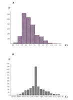 В последние годы (1997-2000 гг.) в районе Ключевского вулкана увеличилось число сейсмостанций сети РТС и повысилась точность уверенной регистрации слабых землетрясений. Но вид гистограмм распределения землетрясений на глубинах -4-20 км и 20-40 км, происходивших в эти годы, не отличается от приведенных на рис.5,А,Б.