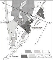 Существующие представления о характере изменения сейсмических скоростей Vp> >в верхней мантии основаны на данных сейсмологических наблюдений [3,4,22,28]. Упругие параметры под Камчаткой изменяются сложным образом, однако в среднем они относительно низкие и в самой верхней части составляют около 7,8 км/с (рис.1). Их значения увеличиваются в сторону океана и северо-западной половины полуострова. Низкоскоростная зона в районе современного вулканизма приподнята до глубины не менее 50 км. По-видимому, скоростные аномалии в верхней мантии отражают процессы, протекающие в зоне субдукции. В районах современного вулканизма нижняя часть коры и верхней мантии характеризуется пониженной скоростью и повышенным затуханием сейсмических волн [22,28,31,32].