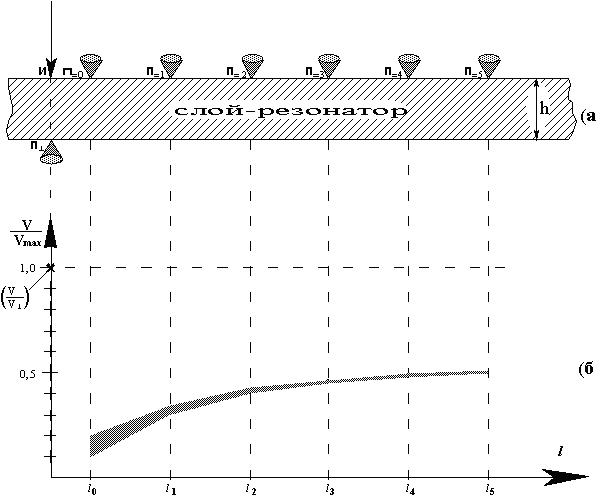 Рис.2 Схема измерений (а) и результаты определения скорости распространения колебательного упругого процесса вдоль слоя-резонатора (б).