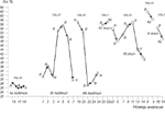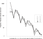 Как отмечено выше, вулканиты кальдерного и посткальдерного комплексов сложены четырьмя последовательными вулканическими толщами. Первая, наиболее ранняя толща, представлена риодацитами, три последующих - дацитами (табл. 1). Вулканиты второй толщи отличаются повышенными содержаниями P, Ti, Cr, Sc, Co и РЗЭ, пониженными концентрациями К и, отчасти, Rb (табл. 1, 2).