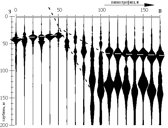 На западном краю профиля (0-50м) мощность осадочных пород составляет примерно 40м, а на восточном (110 - 170м) - 70м. На участке профиля 60 - 100 м выявлено разрывное тектоническое нарушение - сброс амплитудой 30м. В зоне тектонического нарушения кровля гранита не прослеживается, так как гранит в этой зоне характеризуется блочной нарушенностью. Область блочной нарушенности выделена черными штриховыми линиями.