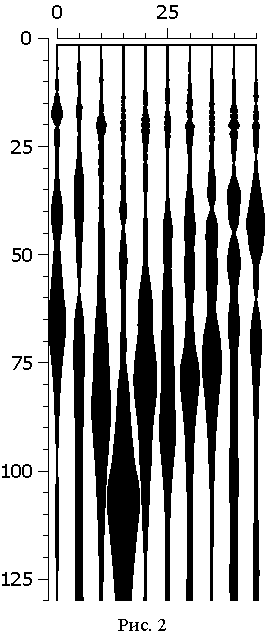 при Vсдв=2500 м/с. Величины раздувов на каждом вертикальном объекте пропорциональны плотности спектра. Шаг профилирования – 10м.