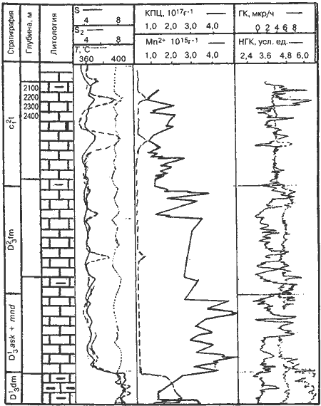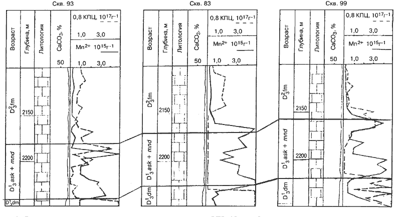 Выделение опорных пластов методом ЭПР основано на зависимости между величиной концентрации ионов двухвалентного марганца в карбонатных породах и условиями седиментогенеза. Присутствие ионов двухвалентного марганца в породе свидетельствует о наличии глубоководных фаций, образованных в условиях явного недостатка кислорода [2]. По концентрации Мn2+, измеренной методом ЭПР, можно судить об условиях осадконакопления, а по аномальным значениям этой концентрации выделять опорные пласты в разрезах скважин.