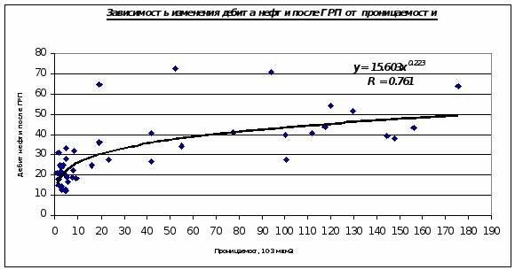 Рис.1. Зависимость изменения дебита нефти после ГРП от проницаемости.