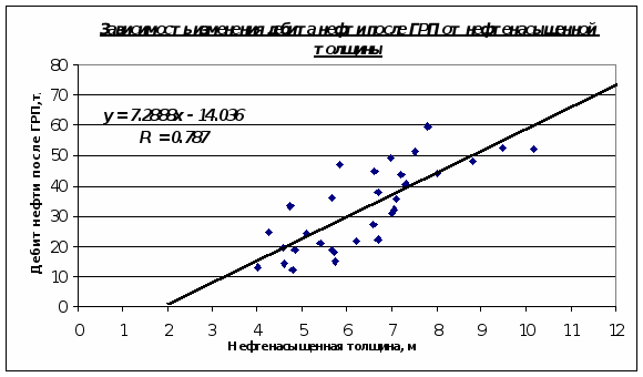 При средней нефтенасыщенной, толщине равной 6 м., дебит нефти после ГРП, определяется по зависимости [3] и составляет 29,2 т./сут.