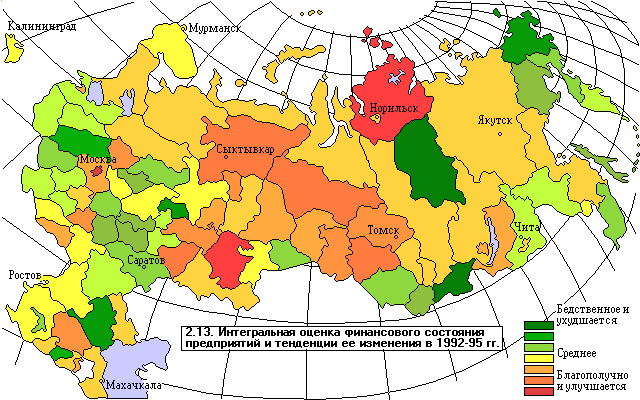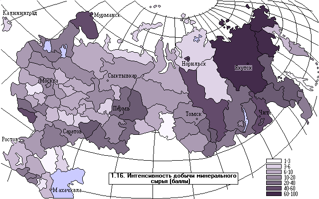 Комплексная оценка остроты проблем исчерпания природных ресурсов основана на соспостaвлении интенсивности использования и потенциальных запасов. В качестве критериев неблагополучия для группы невозобновимых ресурсов выступают высокие объемы добычи при низких запасах. Для возобновимых ресурсов в качестве такого критерия рассматривается низкий уровень производства продукции при высоком потенциале его ежегодного прироста. Интегральный индекс конструировался с использованием той же совокупности весовых коэффициентов, что и при интегральной оценке ресурсного потенциала. Наиболее тревожная ситуация с истощением природно-ресурсного потенциала складывается на юге Европейской части России (карта 1.16), в Ставропольском и Краснодарском краях, Калмыкии, Чечне, Ростовской, Волгоградской, Саратовской, Оренбургской и Челябинской областях.