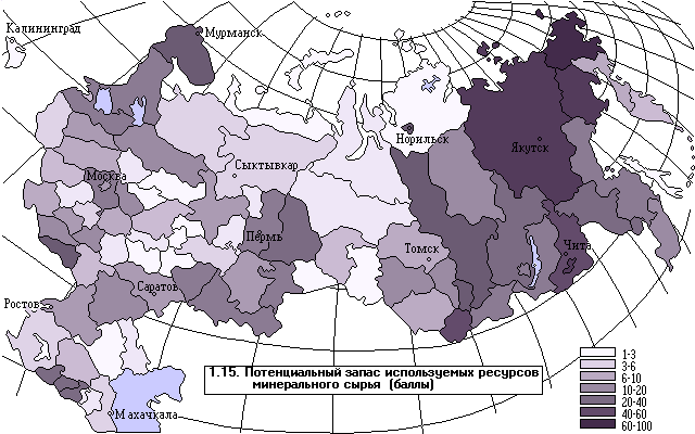 Полезные ископаемые традиционно считаются одним из главных богатств России (карта 1.15). Значительными потенциальными запасами минеральных ресурсов располагают районы Якутии, Сибири к востоку от Алтая, за исключением лишь Таймыра, Сахалина и Камчатки.