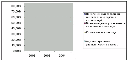 -9850 млн. руб. и –4844 млн. руб. Доля комиссионных доходов в общем «пироге» доходов упала в 2005 и выросла в 2006. А вот расходная часть постоянно падает (с 7.97% в 2004г. до 5.09% в 2006). Чистые доходы от разовых операций однако резко выросли в 2005 году на 4.23% и упали в 2006. Так же в 2005 году на 11% выросла доля резервов на возможные потери. По всему вышеперечисленному можно судить о том, что в 2005 году банк перенес некоторые финансовые сложности (в связи с которыми был вынужден снизить управленческие расходы и увеличить отчисления в резервы), но к 01.01.2007 достиг значительных высот по сравнению с 2004 годом, о чем свидетельствует грандиозный прирост прибыли. Более подробное изменение показателей отчета о прибылях и убытках показано на следующих диаграммах: