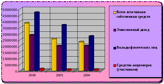 Анализируя общую динамику, можно отметить, что прирост показателя за 2005 г. положительный и значительный, а в 2006г. наблюдается в основном уменьшение сумм по статьям. Значительный рост за 2005г. наблюдался по следующим статьям: Средства кредитных организаций в ЦБ РФ (на 70%)всего активов (36,6%), средства клиентов (на 50%), выпущенные долговые обязательства (36,4%),Переоценка ОС (52%), всего источников собственных средств (27%)