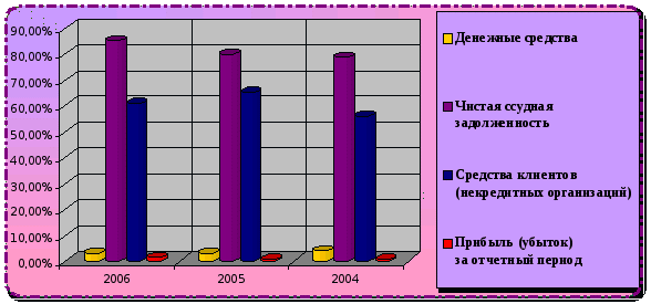 За 3 года (2006, 2005, 2004 гг.) структура банка остается без существенных изменений. Значительную часть активов банка составляет чистая ссудная задолженность, чистые вложения в инвестиционные ценные бумаги, при чем за данный период ее удельный вес вырос на 6.17%. А доля ОС и НМА и материальных запасов снизилась в 2006 году на 0.12% по сравнению с 2004 годом, но выросла в 2005 на 0.12% по сравнению с 2004. Объем денежных средств уменьшился на 1.07%, общий же объем активов банка вырос на 48501540 тыс. руб. за 2005 год и на 115327915 тыс. руб. за 2006 год.