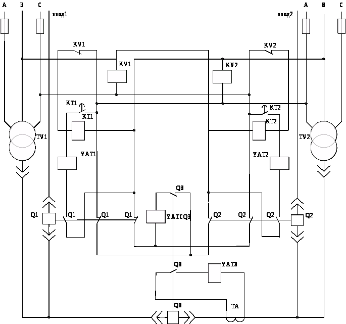 фаза А трансформатора TV2, контакт КТ1, электромагнит отключится: выключаются YAT Q1, блок – контакт выключателя Q1, фаза В трансформатора TV2. Выключатель Q1 отключается, при этом блок – контакты выключателя Q1 в цепи электромагнита включения межсекционного выключателя Q3 замыкаются, тогда по цепи: фаза А трансформатора TV2, блок – контакты Q1; фаза В трансформатора TV2. Выключатель Q3 включится и первая секция шин получит питание. При этом нужно иметь в виду, что потребители третьей и частично второй категории должны быть отключены.