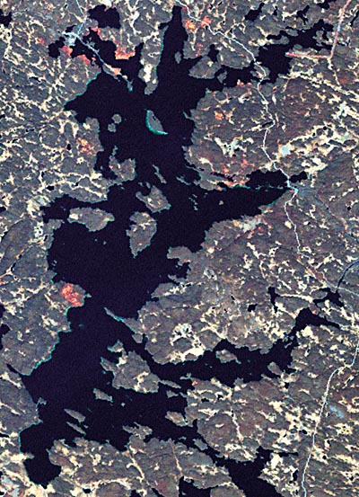 Рис. 8. Заброшенные сельскохозяйственные земли (красный цвет) по берегам озера Каменное. Республика Карелия, Костомукшский заповедник. Космический снимок (Landsat ETM+). |