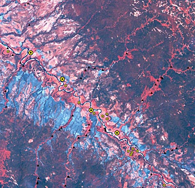 Рис. 7. Участки вторичных лиственных лесов (красный цвет) и лишайниковые сосняки по гарям (голубой цвет), приуроченные к населенным пунктам и охотничьим избам. Республика Коми, Удорский район, долина реки Вашка. Космический снимок (Landsat ETM+). |