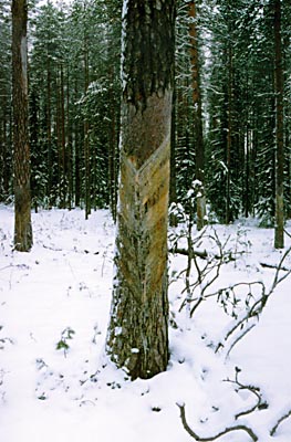 Рис. 29. Сосна, подвергшаяся подсочке. Республика Карелия. Фото А. Ярошенко |