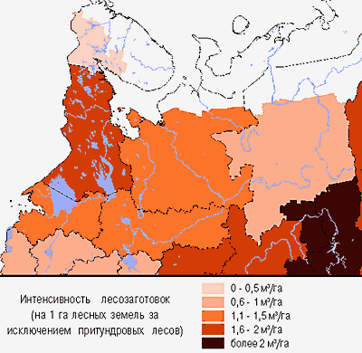 Рис. 31. Интенсивность лесозаготовок по регионам в 1999 году. |