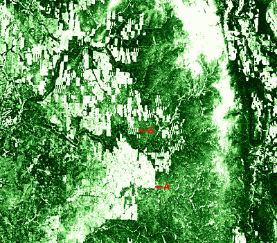 Рис. 27. Вырубки в темнохвойных предгорных лесах Среднего Урала, Пермская область. Космический снимок (Landsat ETM+). А - Сплошные концентрированные вырубки (80-е годы ХХ века) Б - группы лесосек по 50 га (с 1994 года). |