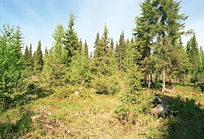Рис. 32. Оставление части хвойных деревьев при сплошных рубках приводит в дальнейшем к формированию смешанных хвойно-мелколиственных лесов. Архангельская обл. Фото А. Ярошенко. |