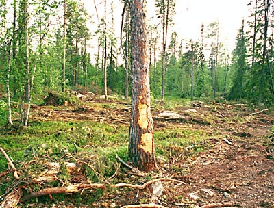 Рис. 28. Сосна, поврежденная при механической трелевке во время “выборочной санитарной рубки”. Мурманская обл. Фото А. Ярошенко. |