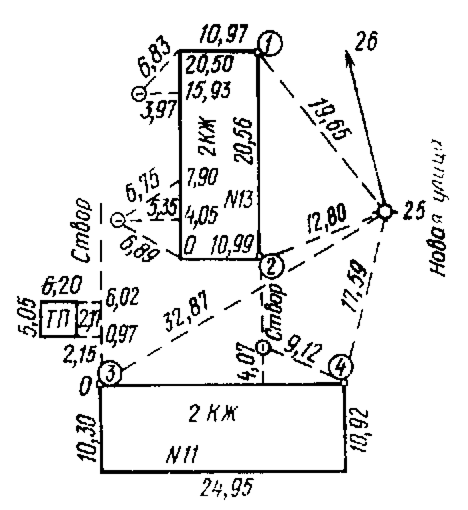 способом перпендикуляров длиной не более 4 м (рис. 3), более длинные перпендикуляры подкрепляются засечками, засечки в этом случае должны быть не более 20 м;