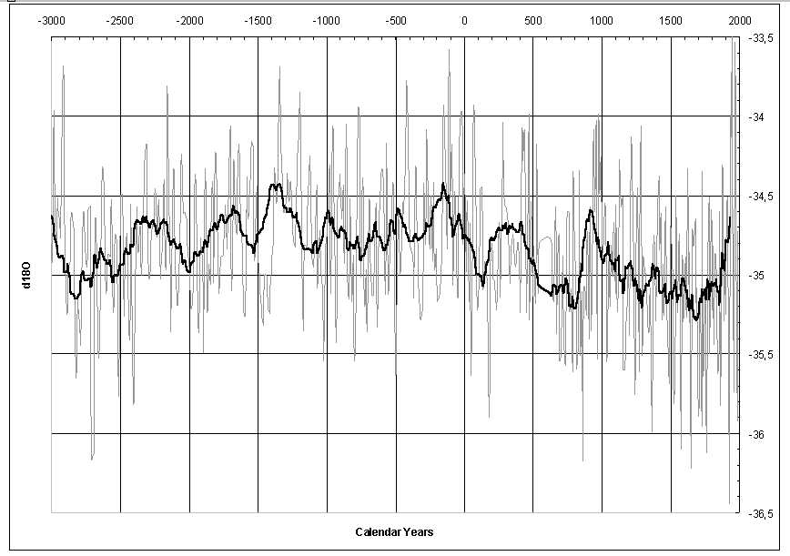Попробуем теперь несколько детализировать картину климатических флуктуаций голоцена для того этапа, который традиционно считается "историческим", т.е. примерно с 5 тыс. лет назад. Наиболее надежным источником информации в данном случае являются огромные массивы льда полярных ледниковых покровов - своего рода природные "винчестерские диски", хранящие информацию об изменениях температурных и влажностных условий за последние полмиллиона лет [см., например, 10, 27]. Для реконструкции климата Северного Полушария на коротких (в несколько тысячелетий) промежутках времени уместно использовать климатический сигнал, выделенный при анализе кернов Гренландского ледникового щита [42].