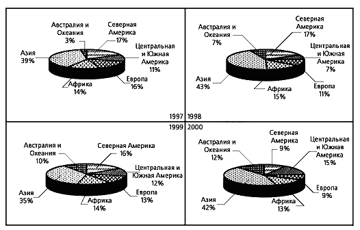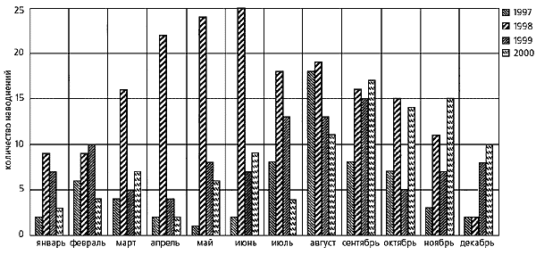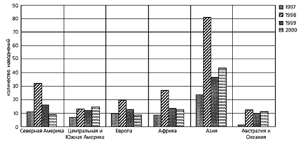 Мы провели анализ этих материалов за 1997-2000 г., результаты которого представлены на диаграммах и в таблице. По числу наводнений первое место все годы стабильно занимает Азия, идущая со значительным отрывом от других континентов. При этом из стран лидирует Китай, в котором за четыре рассматриваемых года произошло 58 наводнений, на втором месте США (52). В Бангладеш, Вьетнаме, Индии, Индонезии, Корее, Таиланде, Филиппинах, Мексике, Бразилии, Австралии, Сомали, России и Румынии случилось более 10 в каждой. Но из всех стран мира более всего страдает от наводнений Бангладеш, где равнинные территории, затопляемые Гангом, Брахмапутрой, Мегхной и небольшими реками, составляют примерно 2/3 всей площади страны.