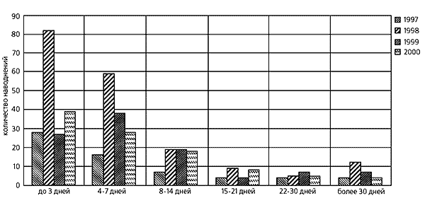 На всех континентах наводнения происходят во все месяцы года. Наибольшее их число случается в апреле, мае и июне, во время таяния снега в Северном полушарии, наименьшее - в декабре, январе, феврале, когда большинство рек сковано льдом. Подавляющее число наводнений имеет продолжительность не более трех дней, несколько меньшее - четыре-семь дней. За 1997-1999 гг. 20 наводнений длилось более 30 дней.