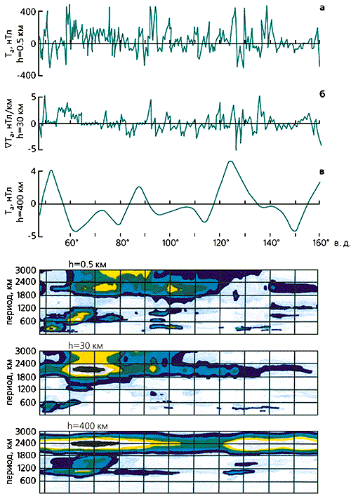 Профили аномального магнитного поля (T>а>) на высотах 0.5 км (а) и 400 км (в) и его градиента на высоте 30 км (б). Внизу - их динамические спектры. Основные пики в спектрах приходятся на периоды L>1> = 400-500 км, L>2> = 1000-1200 км и L>3> = 2200-2400 км.