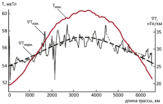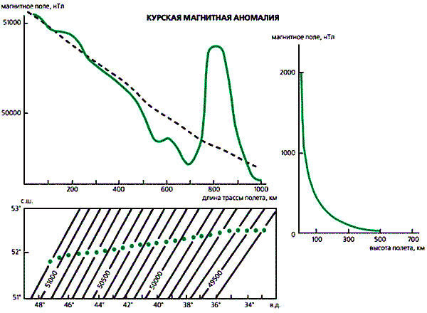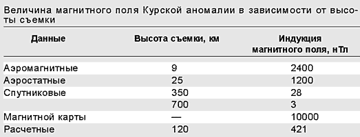Аномальное магнитное поле хранит много загадок. В последнее время во всем мире интенсивно изучаются длинноволновые (от 500 до 3000 км) магнитные аномалии. До сих пор мало известно об их источниках, хотя существование таких аномалий, по аэростатным и спутниковым данным, не вызывает никакого сомнения. Над территорией России проведено много аэростатных полетов, один из первых выполнен еще в 1975 г. в районе Курской магнитной аномалии. В то время для измерения магнитного поля использовался только один протонный магнитометр. Полет позволил совместно со спутниковыми и наземными измерениями понять, как убывает аномальное поле в зависимости от высоты съемки (см. табл.). На высотах ~ 700 км оно даже над Курской аномалией составляет только ~ 3 нТл.
