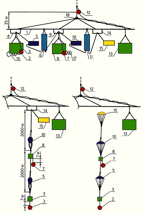 Схема подвесной системы аэростата с размещенным на ней градиентным измерителем геомагнитного поля. Вверху - в стартовой позиции; внизу слева - в режиме дрейфа (рабочей позиции); справа - при раздельном приземлении на завершающей стадии полета основной подвески аэростата и спускаемой части измерителя. 1 - балка подвески аэростата; 2, 7, 12 - датчики магнитометров; 3, 8, 13 - приборные контейнеры с магнитометрами; 4, 9, 14 - пирозамки; 5, 10 - тормозные парашюты; 6, 11 - фалонакопители; 15 - спасательный парашют; 16, 17 - свертки с кабелем-тросом, соединяющим датчики с магнитометрами; 18 - стартовый замок. Развертывание градиентометра происходит следующим образом. При всплытии аэростата на высоте 2 км по сигналу от барореле срабатывает пирозамок (4), а контейнер (3) с датчиком (2) под действием силы тяжести начинает падать. При этом выдергивается парашют (5) из камеры, снижение контейнера замедляется и постепенно выбирается трос из фалонакопителя (6). После того как весь трос будет выбран, контейнер (3) зависает на якоре пирозамка (9). На высоте 4 км срабатывает пирозамок (9), и процесс повторяется для контейнера (8). После выбора всего троса из фалонакопителя (11), выносная часть градиентометра зависает на якоре пирозамка (14) и градиентометр готов к работе. После выполнения съемок на пирозамок поступает сигнал окончания работы, и выносная часть градиентометра отделяется от основной подвески аэростата и приземляется самостоятельно.
