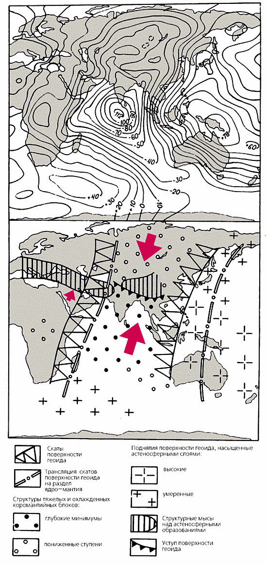 Рельеф геоида в Азиатско-Индоокеанском регионе (вверху) и его тектоническая интерпретация. Стрелками показано перемещение коромантийных геоблоков.
