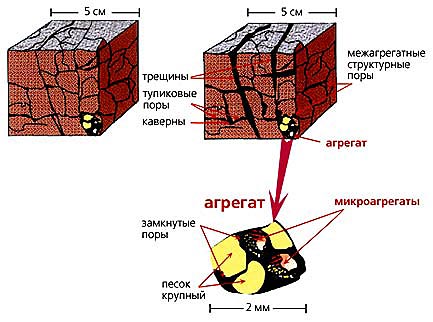 Поровое пространство почвы и структура агрегата. Поры, каверны и трещины, едва заметные (на рисунке слева) в кубике влажной почвы, за счет усадки при высыхании увеличиваются, а при увлажнении сухой почвы (справа) за счет набухания уменьшаются. Агрегаты, хотя и стабильные образования, также подвержены усадке и набуханию.