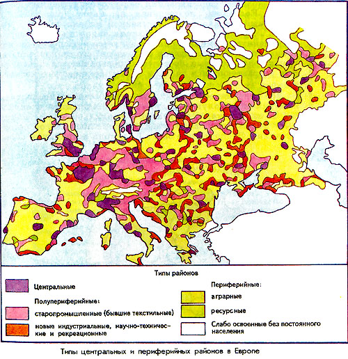 1) Районы-ядра (core-regions), в которых концентрируются передовые отрасли экономики, имеются высокие потенциальные возможности для внедрения нововведений. Они могут быть выделены на всех уровнях и масштабах - мировые, общенациональные, районные центры. В мировом масштабе к этим районам Фридман относил Западную Европу и Восточное побережье США.