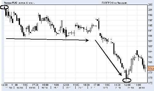 График с часовым периодом за рассмотренный срок сформировался внутри нисходящей волны восходящего тренда, рассмотренного на дневном графике, что объясняет преобладание черных свечек. Откатившись от октябрьского максимума, цена какое-то время находилась в боковом тренде, после чего негативные настроения рынка взяли верх, опустив цену ниже 180 руб. В последние 2 дня тенденции движения цены данной бумаги были противоположными: резкий взлет от точки минимума в четверг и вновь откат на прежние позиции в пятницу.