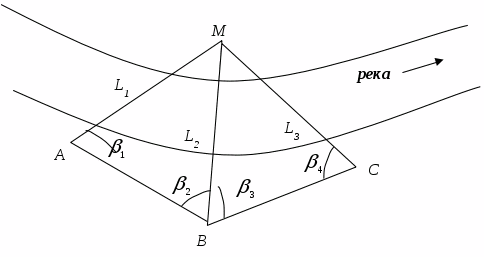 Для контроля на местности можно разбить базис b>2> и аналогично определить расстояния L>2> и L>3>: