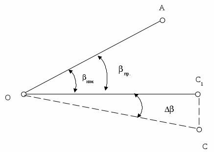 Визирная ось трубы должна быть перпендикулярна оси вращения трубы. Устанавливают теодолит по уровню. При КП наводят теодолит на точку; снимают отчет по горизонтальному кругу. Ту же самую операцию выполняют при КЛ. Коллимационная ошибка вычисляется по формуле: