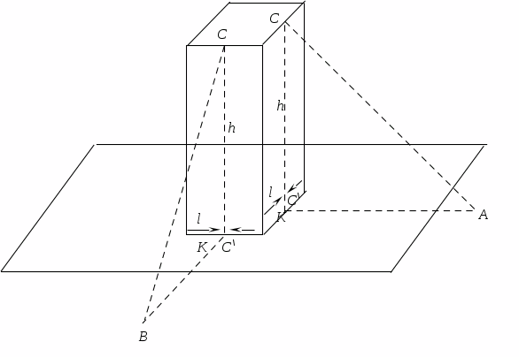 После приведения теодолита в рабочее положение, визируют на точку С и проецируют её на нижнюю часть сооружения, отмечая проекцию штрихом. Проецирование производим при двух положениях вертикального круга. Находим среднее положение проекции (С/). Измеряют расстояние l между центром низа сооружения (К) и центром проекции (С/). Расстояние l измеряют с точностью до 0,001 м. Угловую величину крена можно подсчитать по формуле (18):