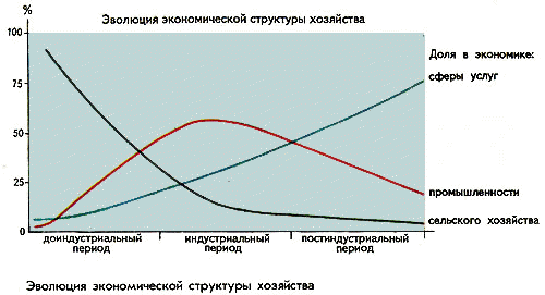 В ходе экономического развития человечества - в доиндустриальный, индустриальный и постиндустриальный периоды экономическое значение главных структурных подразделений экономики - доля в ВВП и численность занятого в них населения находилась в постоянной динамике.