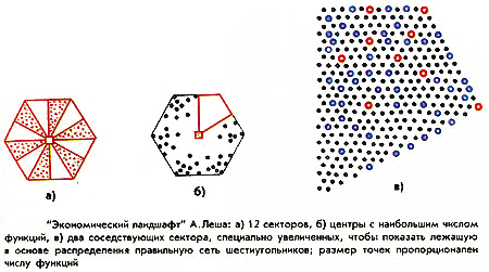 По мере удаления от главного центрального места, система равномерного распределения городов в пространстве преобразуется в "секторальную" структуру, где чередуются сектора, "богатые" и "бедные" населенными пунктами.