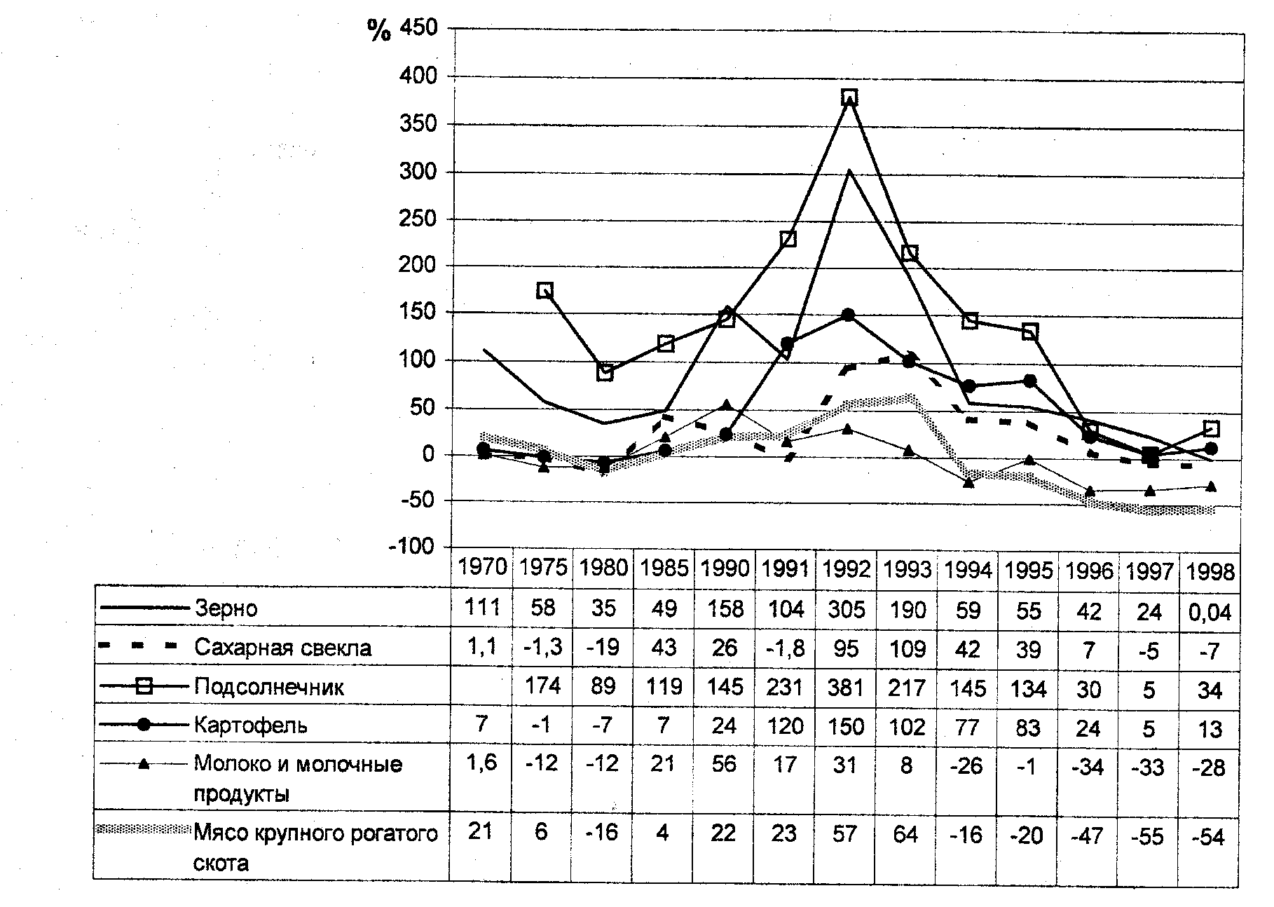 Отметим, что, возможно, роль важнейшего, как считается, фактора -невнимания государства к сельским проблемам, - в современных негативных процессах преувеличена. Как видно на рис. 4, кризис начала 70-х годов вовсе не был связан с отсутствием государственной опеки. Лишь в 1992 году мы видим явные результаты «реформы». Дальнейшие спады - в 1994 и 1998 гг. -были вызваны скорее причинами финансового порядка - окончанием действия льготных кредитов и финансовым кризисом 1998 г.