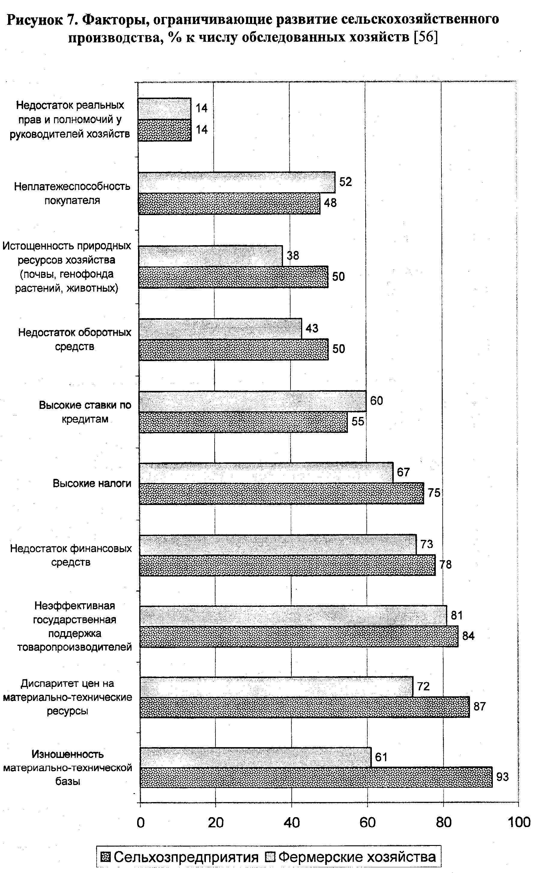 Опросы региональных руководителей и специалистов сельскохозяйственного производства в 30 субъектах Федерации показали несколько иную картину распределения основных факторов, ограничивающих развитие сельскохозяйственного производства:
