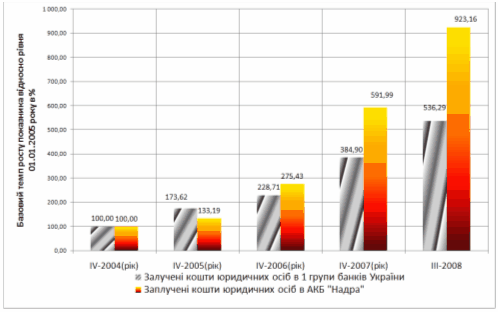 Рис.2.6. – Динаміка базових темпів росту обсягів залучених коштів юридичних осіб в пасивах валюти балансу в АКБ «Надра» та в сумарному балансі банків 1 групи рейтинга НБУ за 2004 -2008 роках відносно рівня 01.01.2005
