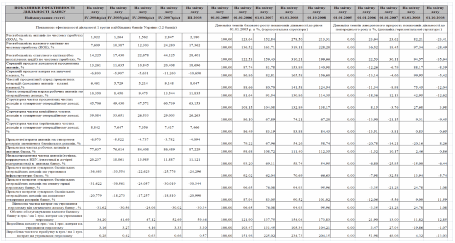 Динаміка показників ефективності діяльності сумарно по 1 групі рейтингу БС України за 2004 -2008 роки