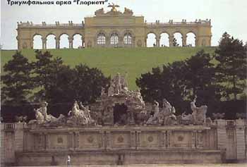 Фишер фон Эрлах разработал грандиозный проект, поставив своей целью превзойти Версаль. Он хотел построить дворец на холме, подчеркнув тем самым исключительное положение монарха. От дворца должны были спускаться лестницы с пандусами. Из-за финансовых сложностей этот проект не удалось реализовать. Вместо парадных сходов разбили парк, завершением которого является дворец - кайзеру всё же пришлось приблизиться к народу. На холме воздвигли" Глориетт" - триумфальную арку в честь победы над прусским кайзером Фридрихом II(битва 1757 года при Колине).