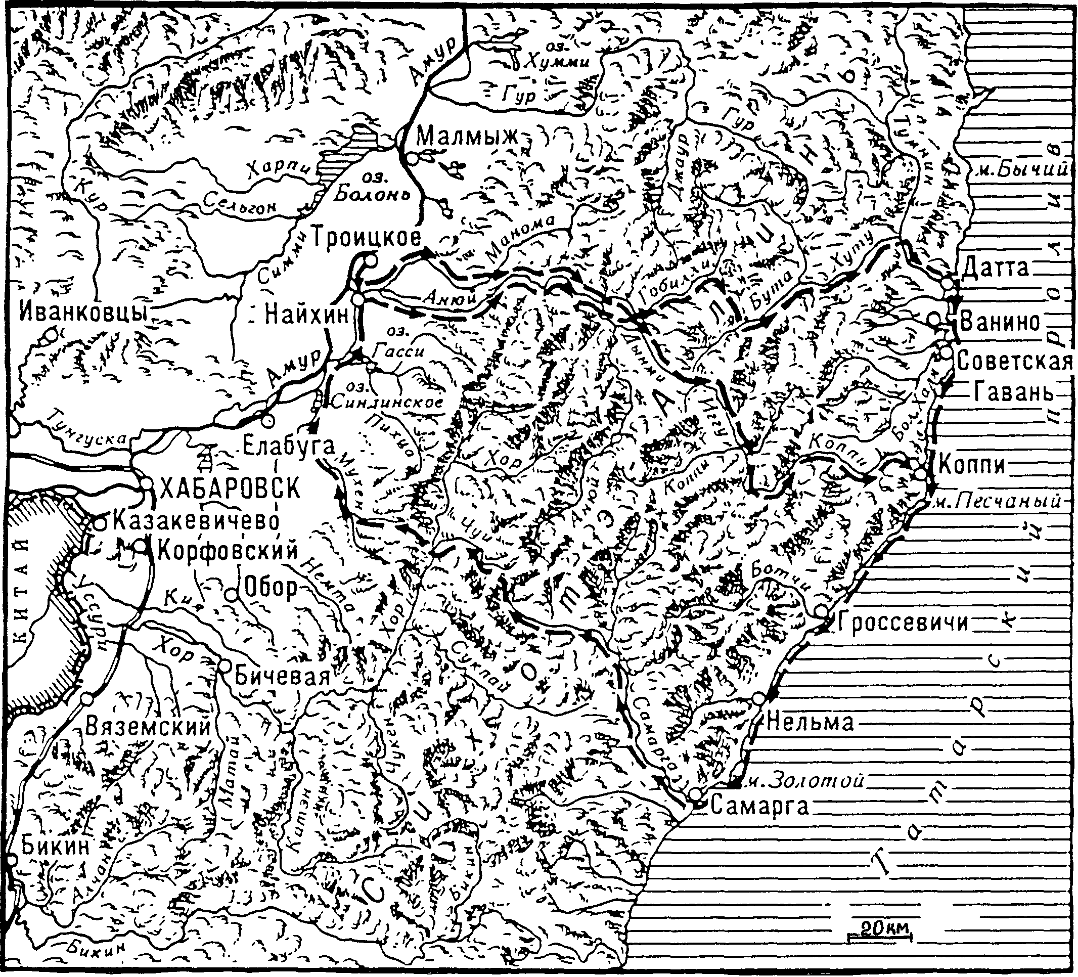 Большую часть своих исследований В.К. Арсеньев посвятил Сихотэ-Алиню и прилегающим к нему территориям (рис.1). Данная территория в физико-географическом районировании [51] выделяется как область средневысотных гор Сихотэ-Алиня, на севере с темнохвойными лесами, на юге с хвойно-широколиственными лесами в нижнем ярусе и с темнохвойными лесами на водоразделах, представляющую собой приподнятую новейшими движениями мезозойскую складчатую зону [51], тянущуюся по берегу Японского моря от устья Суйфуня до устья Амура. Внутри Сихотэ-Алиня лежат две крупные заболоченные межгорные впадины — Удыль-Кизинская и Амуро-Амгуньская. Область хорошо ограничивают тектонические впадины — Приханкайско-Нижнесуйфунская и Среднеамурско-Эворон-Чукчагирско-Тугурская.