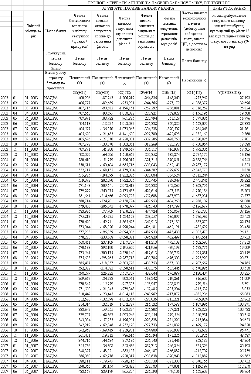 В табл. 3.3 –3.4 представлені розраховані за формулами 3.6 –3.19 вихідні дані за 2003–2007 рік по ВАТ КБ «НАДРА» – відносні агрегати балансу та фактична рентабельність статутного капіталу для регресійного аналізу.