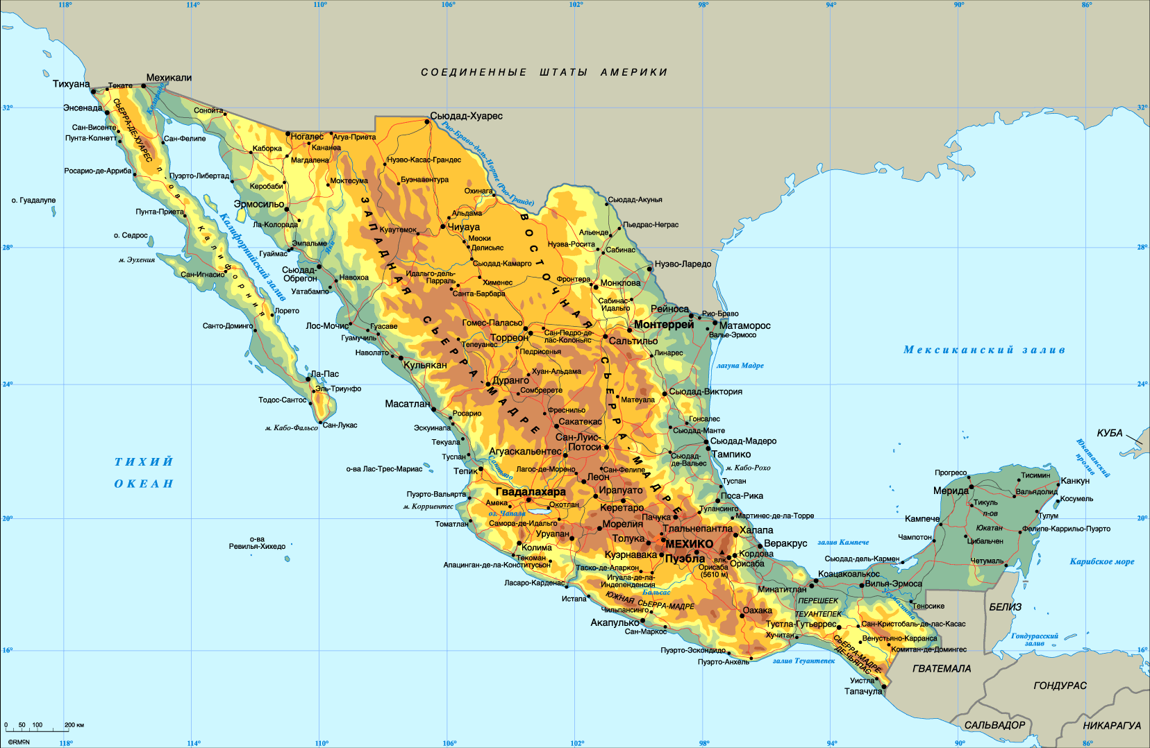 СШМ расположены между Атлантическим океаном - на западе и Тихим - на востоке. Часть Атлантического океана, омывающая Мексику с востока - два окраинных моря, составляющая Американское Средиземное море: Мексиканский залив, омывающий с востока штаты Тамаулипас и Вера-Крус, с севера - штат Табаско, и с запада штаты Кемпече, Юкатан; Антильское море, с востока штат Юкатан и территорию Кинтана-Роо. Еще часть Карибское море, простирающееся дальше к востоку и югу от Центральной Америки - от Гондураса до Панамы. Тихий океан омывает непосредственно берег Нижней Калифорнии и западные берега штатов Наярит, Колима и Халиско, а также южные берега штатов Мичоакан, Чиапас, Герреро, Оахака. Калифорнийский залив составляет часть Тихого океана вдается в сушу между восточным и западным берегом штатов Сонора и Синалоа. Большую часть территории занимает плоскогорье, окруженное горными цепями, которые на востоке и западе резко переходят в равнины. Западная горная цепь сиерра -Мадре Оксиденталь и восточная- Сиерра-Мадре-Ориентальвстречаются в Юго-восточном регионе Ла-Хунта и формируют Сиерра-Мадре-дель-Сан- лабиринт вулкана, среди которых находятся высочайшие точки Мексики (до 5700 метров). Центральное плоскогорье является продолжением долин юго-запада США. Высота нагорья на юге от 1830 до 2440 метров, а на севере от 1070 до 1220 метров. На территории плоскогорья расположен узкий полуостров Баха Калифорния длиной около 1280 км. На юго-востоке страны расположен полуостров Юкатан - равнинный со средней высотой от 20 до 30 метров Основными « водными артериями» являются реки Рио-Гранде или Рио-Браво-дель-Норте, Бальсас-Пануко, Грихалва, Усумасинта и Конилос. Самое крупное озеро Мексики-Чапала.