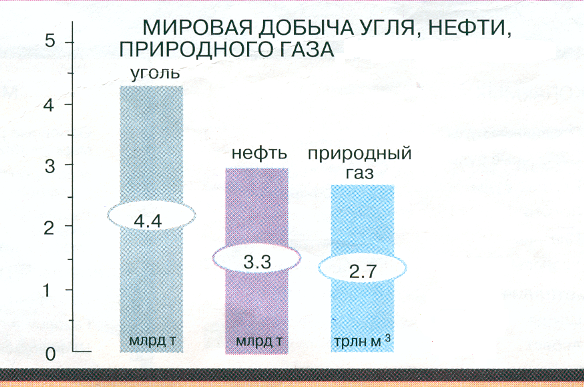 Если обратиться к главным типам мировых природных ресурсов, то в самом общем виде мы получаем следующую картину. Основным видом энергоресурсов пока ещё остаётся минеральное топливо – нефть, газ, уголь. Эти источники энергии невозобновимы, и при нынешних темпах роста их добычи они могут быть исчерпаны через 80 –140 лет. Правда, доля этих источников должна снижаться за счёт развития атомной энергетики, основанной на использовании «тяжёлого» ядерного топлива – расщепляющихся изотопов урана и тория. Но и эти ресурсы невозобновимы: по некоторым данным, урана хватит всего лишь на несколько десятилетий.