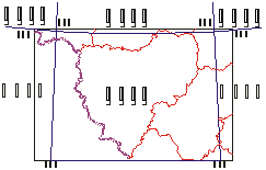 В масштабе 1: 2 500 000 строится макет компоновки. На макет наносится: внутренняя рамка карты, картографическая сетка с оцифровкой параллелей и меридианов по периметру, граница картографируемой области и сопредельных территорий, центр области и основная гидрографическая сеть, названия сопредельных территорий, а также название карты, масштаб макета, размеры по рамке в масштабе проектируемой карты. При построении макета размеры рамок пересчитываются из масштаба проектируемой карты в масштаб составления макета. Сетка и картографируемая территория должна располагаться симметрично относительно среднего меридиана.